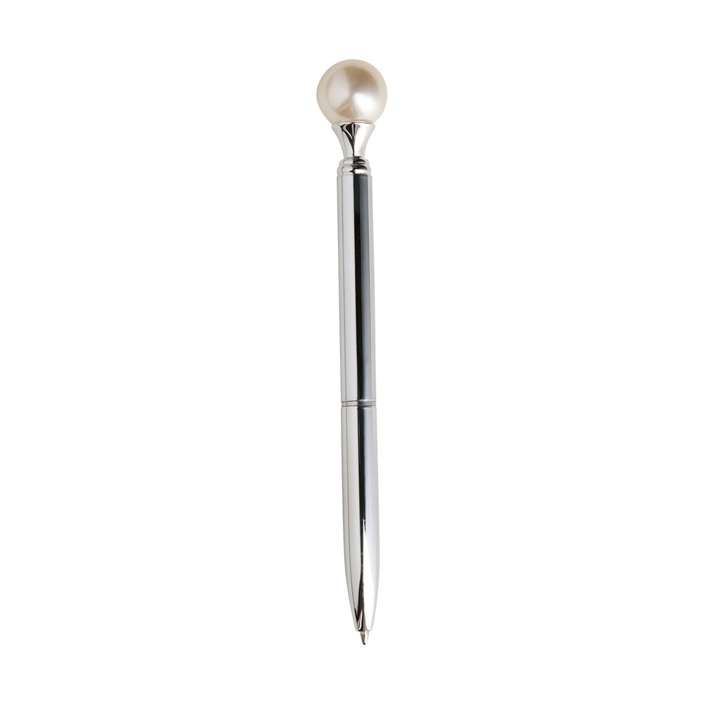 Caneta em metal com detalhe ornamental no formato de pérola. Possui acionamento em clique, destravamento ao pressionar a parte inferior do clipe e carga esferográfica azul de 1.0mm.