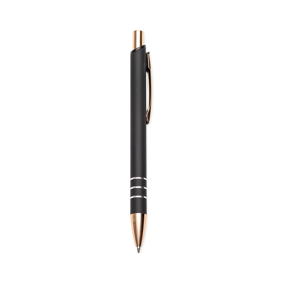 Caneta metálica com acionamento por clique e carga esferográfica azul de 1,0mm, oferecendo uma pegada leve para uma escrita mais precisa.
