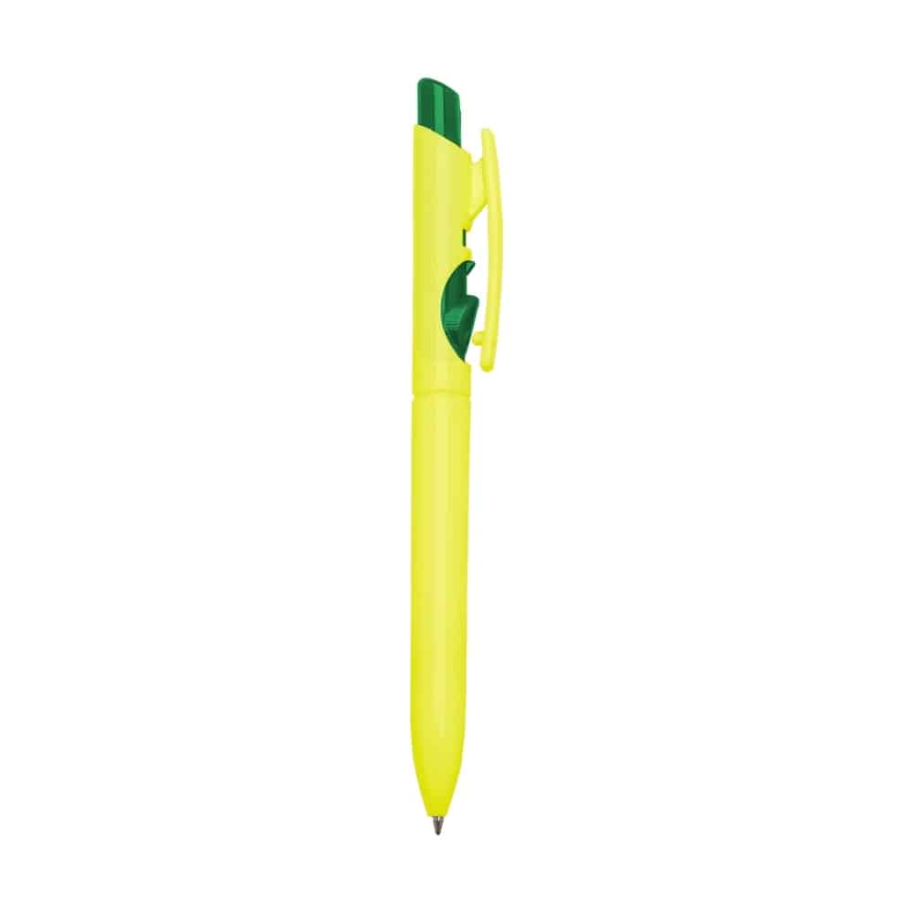 Caneta plástica com carga esferográfica azul e acionamento por clique.